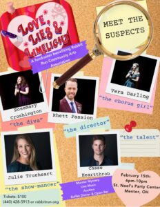 Romance and mystery are bundled together in the wildly entertaining and interactive whodunit “Love, Lies and Limelight”. Join us Sat., Feb. 15, and celebrate Valentine’s Day in style at this Rabbit Run fundraising event.